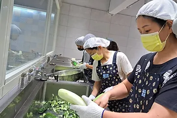 透過櫥窗,可以看見校廚辛勤的工作,並讓學生了解學校校廚每日烹煮1500人份的午餐,其中光是蔬菜,每日竟高達90公斤,在洗滌、切菜的前置準備上,相當辛苦。