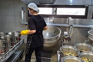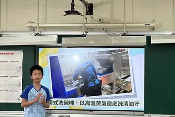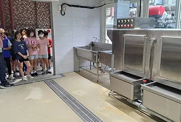 帶領學生了解每天餐車上乾乾淨淨的餐桶,其實都是經過校廚每日使用高溫機器的清洗,雖然現代廚房有許多大型機器可以協助校廚清洗餐桶的工作,但是餐桶進進出出洗碗機,仍需要人力進行。學校廚房每日餐桶約300個,所以每日要將300個鐵餐桶內的廚餘先倒掉,再將300個鐵餐桶放進洗碗機,再拿出洗碗機,再上到消毒櫃,工作量是很大的,讓學生體會校廚工作不易。