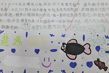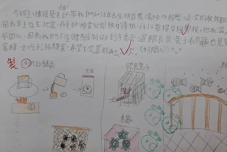 在上週花蓮強震的當日,參觀社區的農場後,小孩也在空白的紙上寫下了參觀的心得。我喜歡用這種不設限的方式,讓小孩寫下他們想說的、想畫的,沒有限制。讓小孩在自己的空白時間,寫下真實的感受。