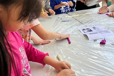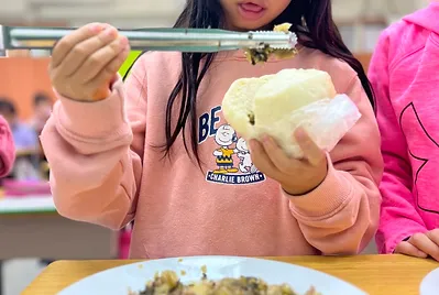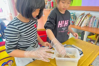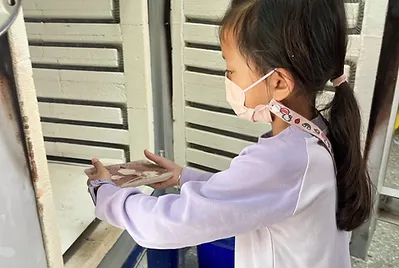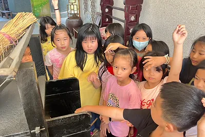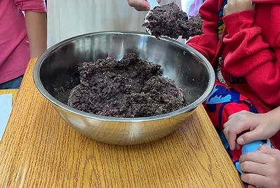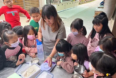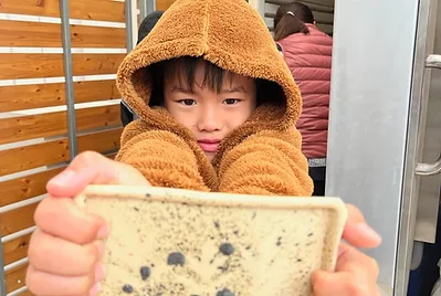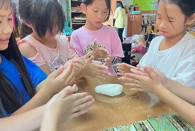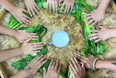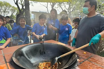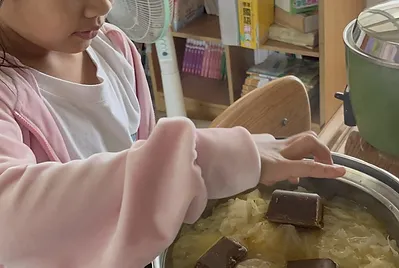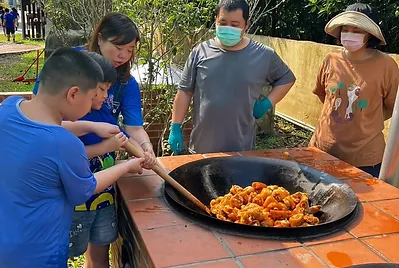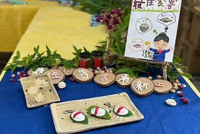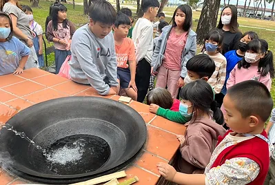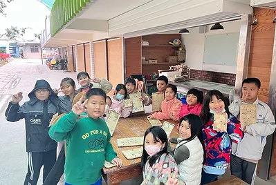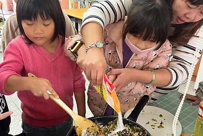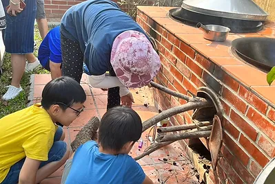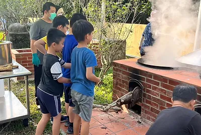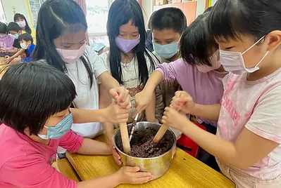 食物與在地文化的連結鑲嵌在客家的節慶之中,客家人過新年做發粄(發粿)祈求來年能發財。學期末的最後一天,提前體驗過新年的的氣氛,我們一起用學校的大灶,用柴火共下來做發粄(我們一起來做發粿)。