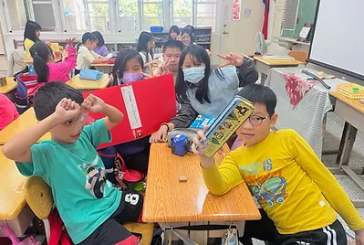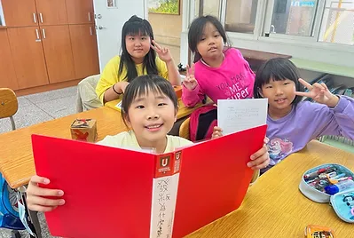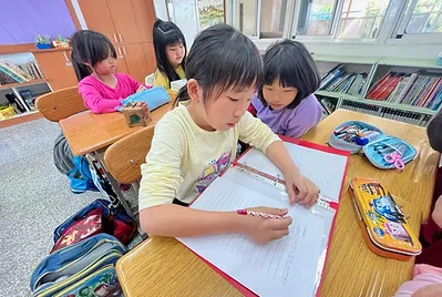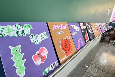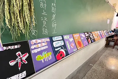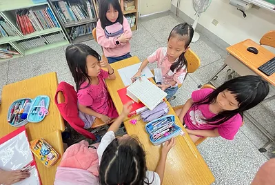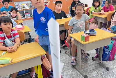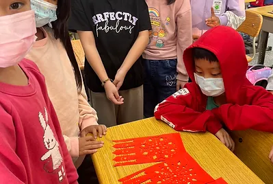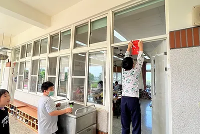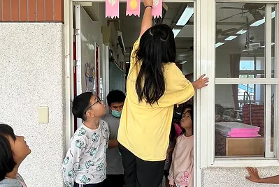 高個子的孩子是貼手,站在椅子上踮起腳尖貼五福紙,旁邊還有小幫手幫忙喬正位。分工合作下,我們的教室有的客家味的新氣象。