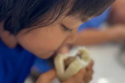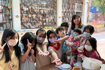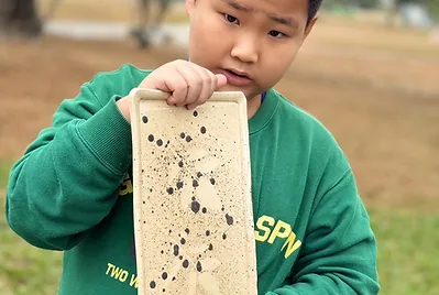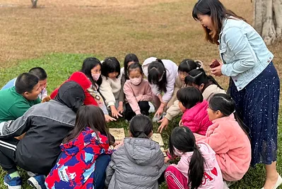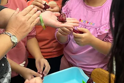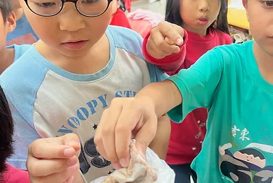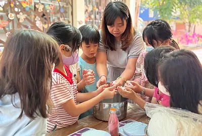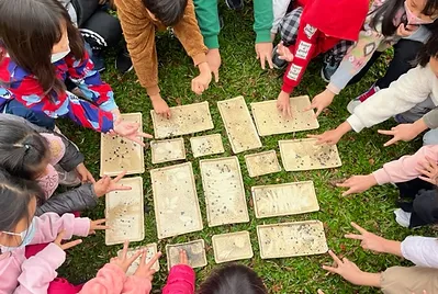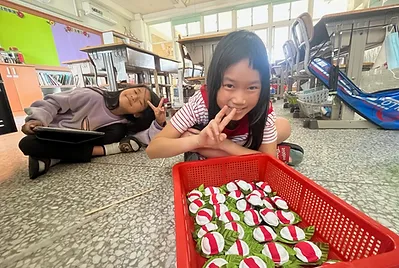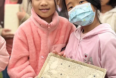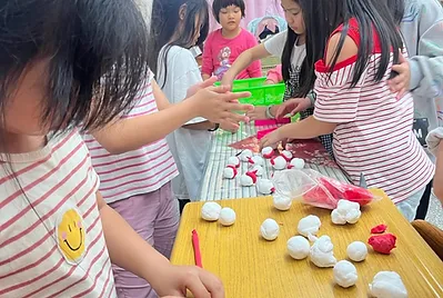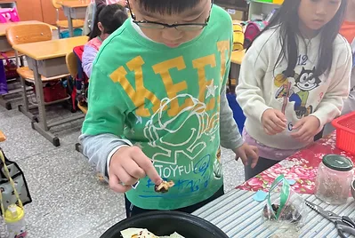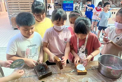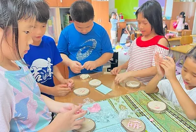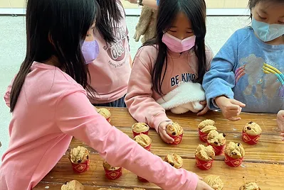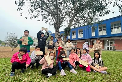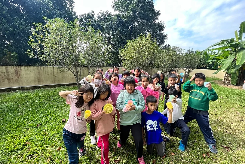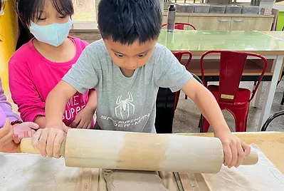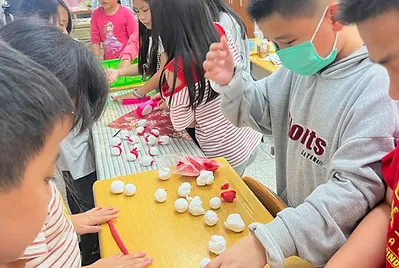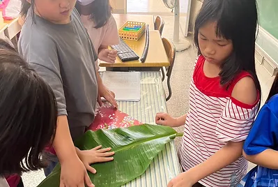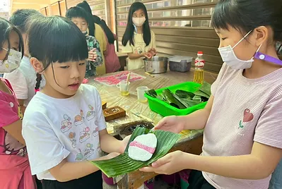 從大自然的餐盤開始,小孩親採香蕉葉和菠蘿蜜葉當作紅粄的盤子。用最傳統的紅豆和芝麻口味做紅粄,而紅粄中間的掛紅用的是我們天然色素洛神花的紅,在指導員龍老師、校廚郁慧阿姨的幫忙下,我們去大灶柴燒紅粄,跨年段的和幼兒園、一年級一起做客家人掛紙紅粄仔。