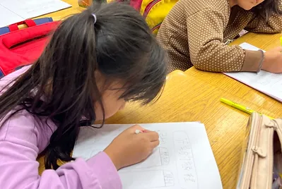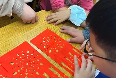 過年貼春聯,客家人貼紅紙過新年。在家裡,個子矮小的孩子總是沒有機會在高高的門框貼紅紙;開學的第一天在教室裡,用儀式實踐新年儀式,象徵新學期的到來,也象徵小孩的夢想食驗事的到來。