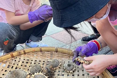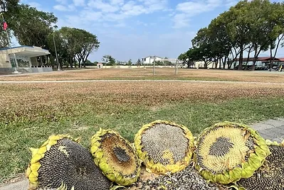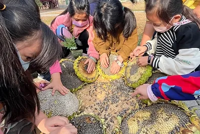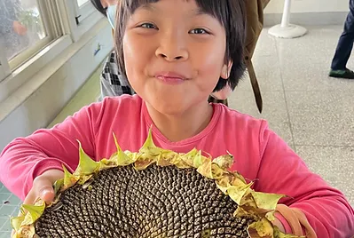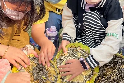 小田的向日葵種子收成的數量太少,不足以供應炒葵瓜子課程及明年播種的數量。社區裡鍾叔叔家剛好在過年期間種了一塊地的向日葵花海供民眾欣賞,叔叔送了我們一些花托供應課程使用,每顆向日葵花都比我們的臉還大,「哇哇」聲不斷。