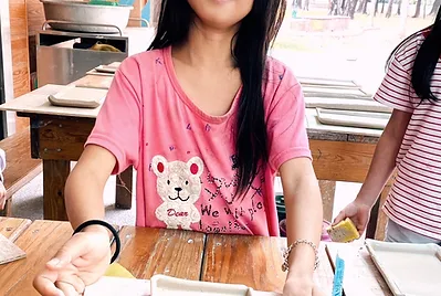 歷經一星期亁燥的餐盤,確認沒有破損後,今天美術老師帶領我們為它們上釉。