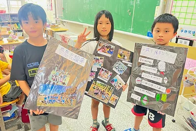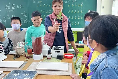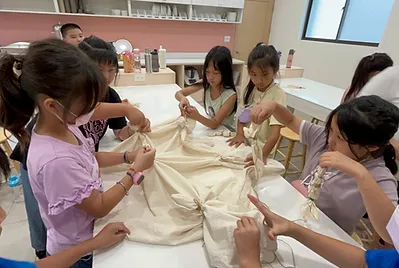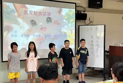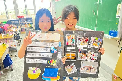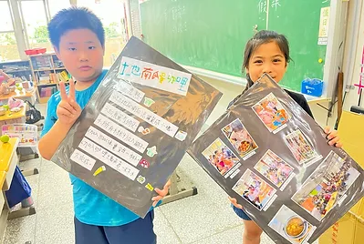 這個學期孩子們擁有自己的飲食夢想,從自己做的野蓮泥漿釉大餐盤開始,用它來盛裝他們的小小夢想,三個月來從阿婆的鹹菜、發粄、紅粄、滷豬腳、鹹豬肉...等客家菜,到食育知識裡的營養均衡菜單與飲食專題探究,我們自己種下稻米和小田農作物,從產地到餐桌並友善土地,做成天然色素用來渲染餐桌上的菜色與桌布;利用科學原理做出美濃清冰和蝶豆藍染桌巾;實現了用客家美食交朋友的校際交流;達成了全班一起踏察老街美食吃炒粄條的夢想;成就了10歲小主廚的願望,做出小孩客家菜,把客家菜帶回家。
