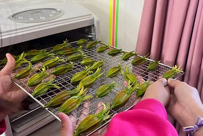 採下小田的蝶豆花,平舖在乾燥盤上,小手要注意將每朵花之間都保有空隙,而且蝶豆花輕而小,必須在烤架上舖上烤盤紙,才能使蝶豆花徹底的烘乾而不掉落。