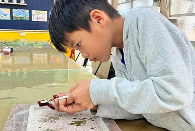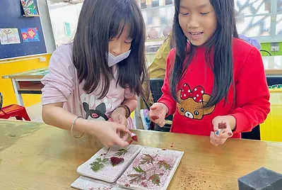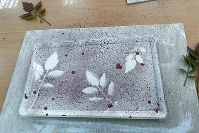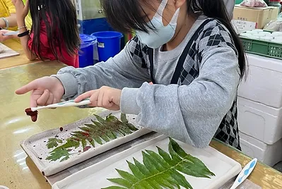 尋找校園的植物,在餐盤上用牙刷將釉料撥灑在餐盤上,拓印出植物的形狀,真美~原來大自然就是最棒的畫家。