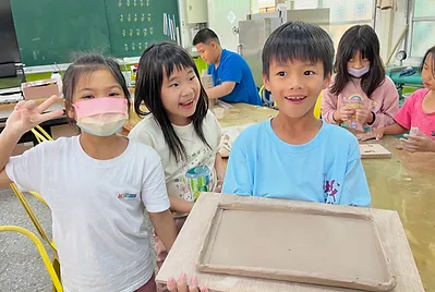 或許沒有陶藝大師精妙的手藝,沒有藝術家厲害的繪圖;但是,我們有在地的野蓮陶土釉,有校園裡的客家植物當畫具,更有我們對於這個土地的連結。大地色系的大餐盤,點綴陶土釉的咖啡色斑點,是我們的特色。