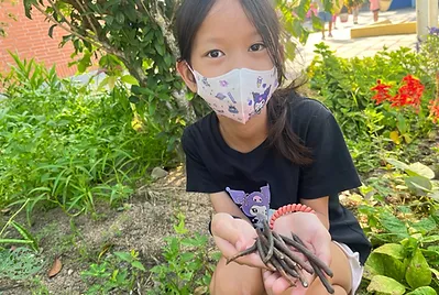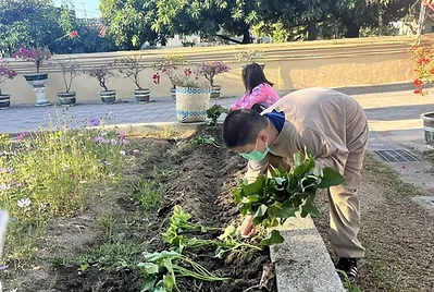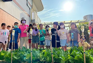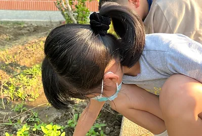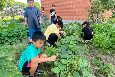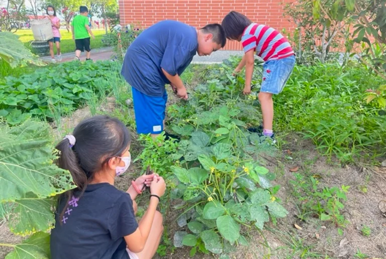 配合自然課「蔬菜的成長」,來學植物生長的四要素(水、空氣、土壤、陽光),檢視我們的小田這四樣條件都符合,除了二棵桂花樹下方的陽光較為不足之外,討論適合這個季節的農作物有空心菜、蔥、小白菜、萵苣……等等~最後依最佳食客的課程決定種下萵苣、蔥、空心菜和隔壁陳叔叔送我們的南瓜🎃。