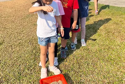 有了這個概念,我們想要高雄的風也很大,那麼就來利用大自然的風穀機來將葵瓜子與雜屑分離。把我們的手當穀斗,找到校園裡風向最大的位置,把自己身高當做是風穀機的高度,慢慢的灑下葵瓜子,風就把雜屑吹走,而重量較重的葵瓜子就掉在我們的籃子裡~~~~大自然真是奧妙呢!