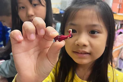 我們從認識洛神花開始,原來洛神花吃的是花瓣,中間的果實被緊緊包住,要除去果實就必須要把花瓣一個一個撥開才能辦到;但是花瓣上卻有小小的毛刺,雖然有點刺刺的感覺但是不足以傷害我們的小手,小心就好~