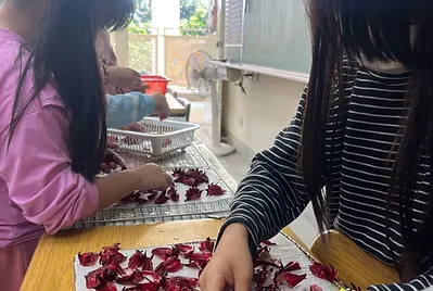一個個處理好的洛神花,排列整齊送進來乾燥箱,等待兩天的烘乾,保存大自然的色彩。然而,洛神花的紅也在我們的小手上留下了紅色的印記~