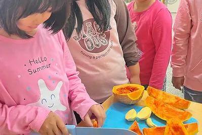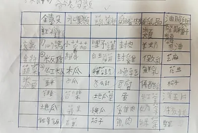 從食物的六大類著手,認識地瓜屬於五穀根莖類。從烹煮食物的邏輯著手,相同屬性的食材可以替換也應該會很好吃。於是,孩子們一同來想出自己家裡種的食材有沒有符合的品項,設計屬於吉東自己的咖哩飯。喬喬阿嬤種的高麗菜是蔬果類,代替紅蘿蔔;巧蓁阿嬤自己養的雞生的雞蛋是肉魚蛋類,可以代替雞肉;我們自己種的地瓜可以代替馬玲薯(但是地瓜收成太少,社區叔叔送南瓜代替)。於是擁有蛋白質、蔬菜、五穀根莖類的營養「地產地消地南瓜咖哩」誕生。