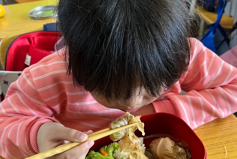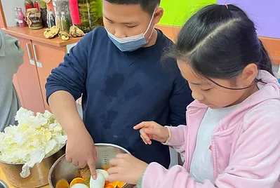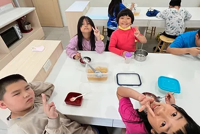 從削皮、練習使用刀具、放電鍋的方法、在電鍋加水,都是第一次的新體驗。完成的咖哩香氣四溢~邀請高年級的大哥哥大姐姐一起分享。