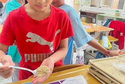 想要解決這個問題。老師帶我們認識風穀機,原來風穀機可以分離稻殼與米,依靠的是風與重量的原理,風會吹走重量輕的稻殼,而重量比較重的米就會掉到地上。