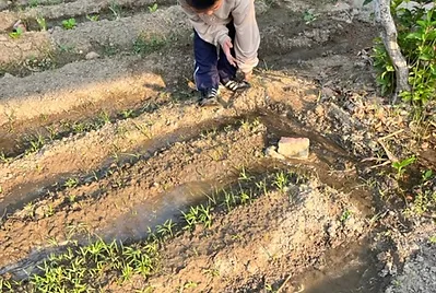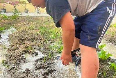 我們的小田土壤是保水度比較差的砂質土。種菜的一開始,我們就會一直面臨水問題。上學期種菜,班上還要在假日輪班到學校澆水;這學期,學校圍牆外的叔叔教我們用客家人種田的方法「蔭水」(灌溉)試試看。