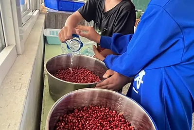 這一週,我們也來一起用食物體驗客家掛紙。用在地小農生產的美濃紅豆為內餡,結合幼兒園與低年級,小手與小小手一起來做客家紅粄仔。二位小型男主廚幫忙煮紅豆,電鍋加水,紅豆加水,紅豆經過三杯水的大火翻滾,擁有堅硬外殼的紅豆,轉化為鬆軟的紅豆泥,但是那種泥,還不足夠均勻。利用撖麵棍把紅豆泥搗的更軟爛;加入紅糖讓更香甜。
