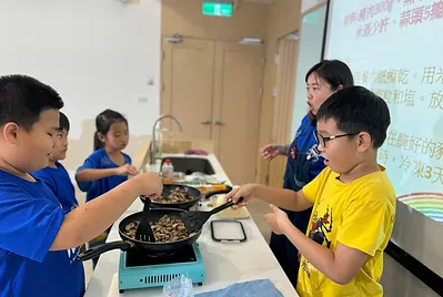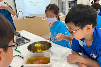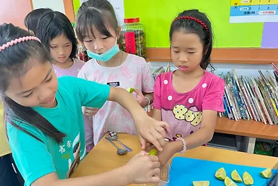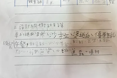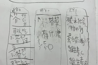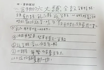 課程中,我們在健康課學會食物六大分類。在數學課中計算咖哩要加的水量是3000毫升,還要知道如何用量杯量水才正確;在國語課學會圖文式筆記法記下食譜,回家做給家人吃。