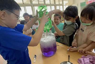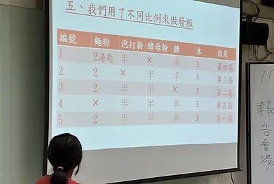 透過專題探究的方式,利用實驗法,將發粄的配方逐一拆解原來是麵粉和酵母粉的雙方合作的功勞,泡打粉是加油手。