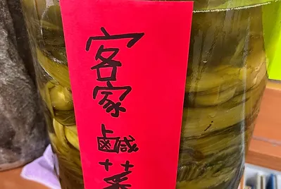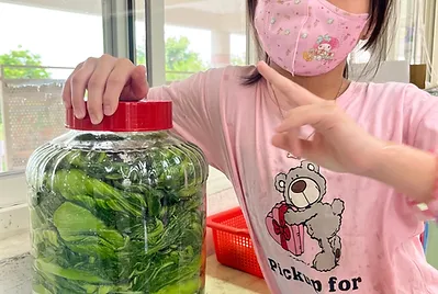 利用塩漬法製作的鹹菜,時間把它施魔法,變成好味道的客家味。美濃居民喜歡切絲加糖和肉末調味,夾入饅頭形成當地的鹹菜刈包。小孩試著嚐試生的鹹菜,只有鹹味不好吃。加上糖和肉,瞬間美味度上升的好吃~