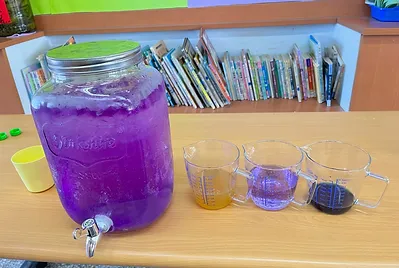 藍色和紫色食物很少見,我們用它的藍加上檸檬藍就變成紫色了,很酷的廚房科學~
