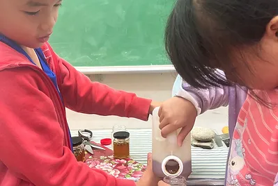 今天,真實的摸到愛玉籽刺刺的感覺、看到它的大小比芝麻還小、搓洗的時候滑滑的,真實體會課文中的內容。運用數學的容量單元,量出正確的1400毫升,輕輕搓揉直到水漸漸變黃~愛玉就變身完成✅
