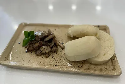 以客家拜拜的三牲之一~豬肉為主題,利用食物保存塩漬法,炒香黑胡椒和塩,利用米酒和蒜頭去腥,舖灑花椒和香料,除了用自然的方式延長食物保存期限,也增添不同的料理方法~