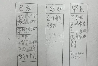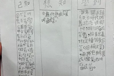 他們用社會課本學到的「已想學」一同思考芥菜的三兩事。原來,芥菜的一生有四代,芥菜→水鹹菜→鹹菜乾→梅乾菜;原來,芥菜很苦卻還是很多人喜歡吃,因為芥菜富含豐富的營養素還有蛋白質呢!原來,芥菜的苦是因為還有硫化配醣體,而塩可以去除它,難怪鹹菜用塩醃就不苦且好吃。