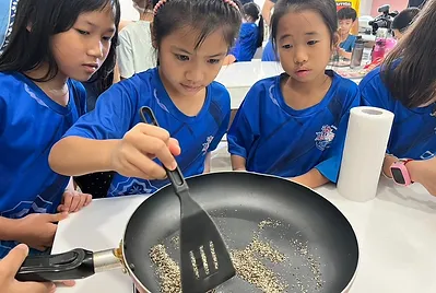 從認識升火的三原素:空氣、燃料、熱度開始,在五年級的學長姐的幫忙下,成功升火,大灶啟動。發粄製作從重量學習開始,調配完美比例的發粄粉漿,在校廚郁慧阿姨、龍老師的協助下,經過十分鐘的蒸氣浴的發粄,成功脫變成客家人口中會發財的發粄。跟著客家人過新年,從此開始~~