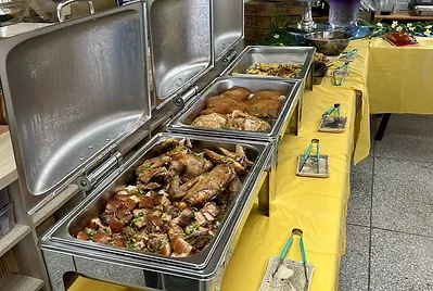 把客家拜拜的三牲-雞、豬、魚,延伸特色的客家料理。封雞、封肉、封冬瓜,封高麗菜的系列客家封菜;三忠親手做的客家鹹豬肉,代為現代流行鹹豬肉披薩;班級製做的天然色素粉則是彩虹🌈果凍的魔法粉,健康又美味😋。