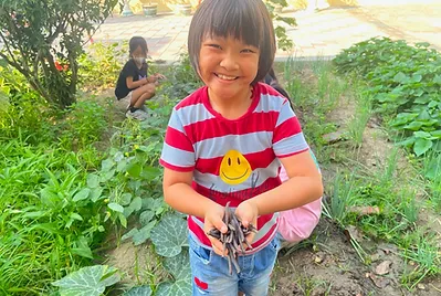 小田的蕃薯今天收成了,小手在小田挖呀挖,挖出了二條大地瓜,後熟形的地瓜,要放個幾天會更好吃。