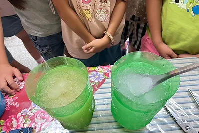 天氣熱,讓我們想起古早的客家味清冰。為什麼清冰會和冰塊不一樣?原來是冰塊的大小不一樣,那麼如何用家裡的冰箱和空的寶特瓶做出我們的清冰呢?原來利用冰結晶的過程就可以達到,在結冰的過程中,不斷地利用搖晃把冰給打碎,就可以做到我們想要的清冰。配上我們自己洛神花粉,不只讓純白的清冰變成彩色、還染上微微的洛神花味道。美好的夏天~