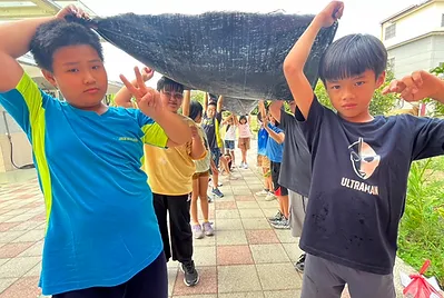 小孩量出小田的長度,找出需要鋪設抑草蓆的地方,同心協力,完成這項任務。舖好之後,還要在上面來回踏幾次,才能讓草蓆和土壤充分的接觸。才能達到最好的效果。