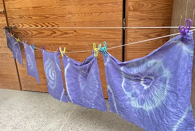 和蝶豆花粉,加上廚房的調味料,沒有任何一點化學藥劑的廚房蝶豆花藍染,利用科學裡濃度高低與水份的流動關係,成功的將自己的桌巾染成天空的藍,這個美麗藍恰恰與吉東教室屋頂的藍、天空的藍連成一片~美極了