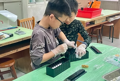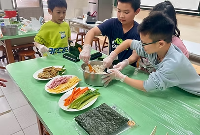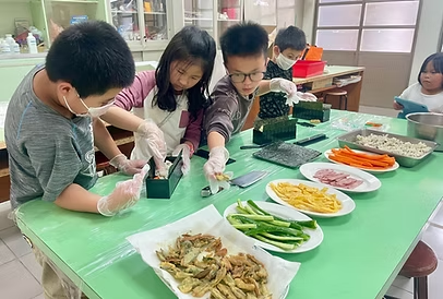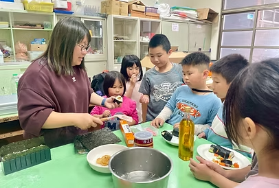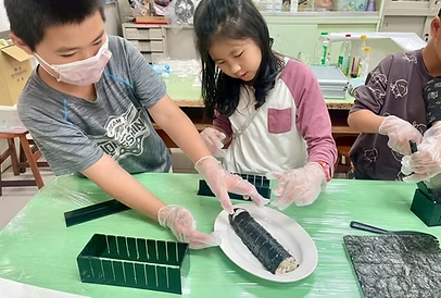 包壽司的過程中,大家互相合作,將茶香飯鋪上海苔後,再把各種壽司料放入其中,利用模具將壽司壓緊實,最後將壽司切開,一個個美味又好吃的茶香壽司就這樣完成囉!