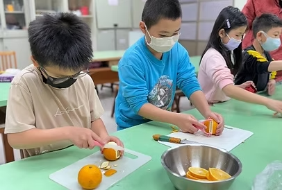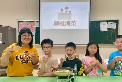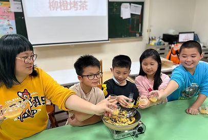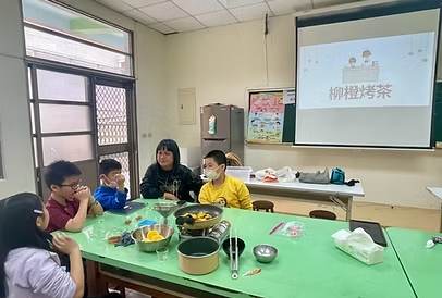 這天,我們依照上次討論內容,進行了柳橙烤茶的改良,學生對烤茶的製作過程越來越精熟,我們很快就完成了第二次的試做,大家拿起煮好的柳橙烤茶,懷著期待的心情喝下,臉上掛著滿足的月亮微笑,我想我們這次成功了!這次試做的結果大家都很滿意,讓我們成就感滿滿,也讓我們開始期待下次的茶料理試做……