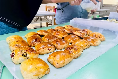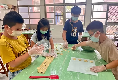 當麵團揉好後,我們帶著哥哥姊姊進行塑形,一邊動手一邊分享小撇步,像是司康的大小要剛剛好,擺放時要留出空間才能均勻受熱。能把自己的經驗傳授出去,讓我們感覺自己也變得更專業了!
