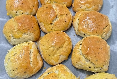 隨著計時器的響起,紅茶司康終於出爐了,看著蓬鬆且金黃外表的司康,我們知道試做成功了,看著我們辛苦完成的紅茶司康感到非常開心,也想把這份喜悅分享出去,於是我們便將完成的紅茶司康分享給學校師長同學,大家吃完後也都豎起了大拇指,讓我們獲得了滿滿的成就感,看著大家吃完紅茶司康後臉上滿足的表情,不知不覺間,暖暖的幸福也在心中出爐了……
