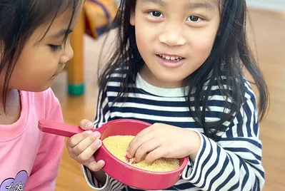 老師拿出小米,請幼生摸摸看聞聞看! A幼生說,這好像我吃的益生菌一樣。B幼生,這個味道好燕麥的味道有點香。