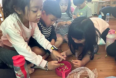孩子從家中帶來的樹豆,老師請幼生一起來把樹豆剝剝看,讓孩子親身體驗剝的感覺,也促進幼生的精細動作大小肌肉的發展。
