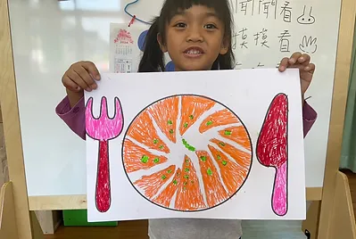 老師請幼生繪畫出屬於自己的原住民風味餐盤,在繪畫過程中,幼生遇到困難說,老師我不會畫樹豆、刺蔥等。老師在旁引導並協助,也請幼生們發揮自己的魔法想像力,過程中看見幼生能互相給意見,互相幫忙,這是學習的美好過程。