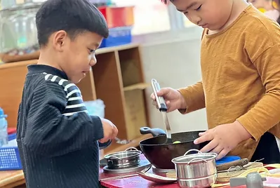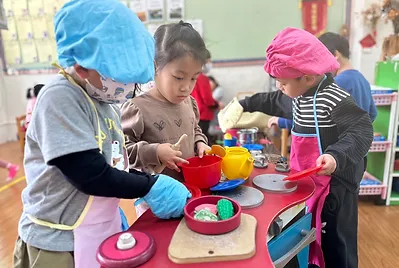 幼生在烹飪區當小廚師! 廚師問:你要買什麼呢? 幼生:我要一個刺蔥蛋餅!老師在觀察並記錄孩子們的對話,讓課程越來越有趣囉!