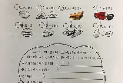 學生在分組操作中學習食材分類與飲食均衡的概念。