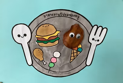 第一張圖片是學生自己設計的「種子早餐餐盤」,這是一項有趣且富有創意的活動。學生利用畫紙製作了一個餐盤,上面繪製了各種早餐食物,例如漢堡、炸雞、三色糰子、冰淇淋等,並且在某些食物上加入立體的種子材料,使整體更具立體感與趣味性。這種手作活動不僅能激發學生對健康飲食的興趣,也能提升他們的創造力與美感表現能力。透過這樣的方式,學生可以更直觀地認識各種食物,並進一步學習均衡飲食的重要性。