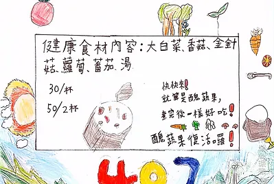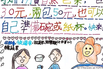 四年級的郭冠頡說:「我和同學利用醜蔬果製作水果沙拉,把不好的葉子去除,加入番茄、蘋果、沙拉棒和餅乾,就成了美味的醜蔬果沙拉。原本以為沒人會買,結果銷量超好。」