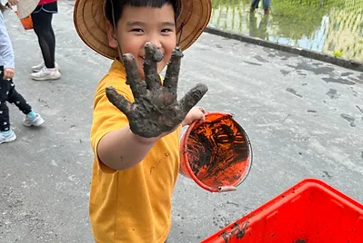 上次訪問過阿牛叔叔後,寶貝們也想自己種植稻米,阿牛叔叔大方地分享稻田中肥沃的土,寶貝們穿著雨鞋拿工具,站在灌溉的溝渠中挖呀挖呀挖!大家挑戰挖黏黏糊糊的土,一起合作表情猙獰的搬運泥土 春風煦煦~~開心啊!