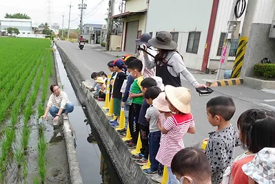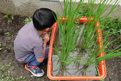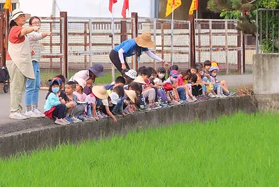 孩子們問:疑?怎麼田中有一塊一塊的草?那是雜草嗎?還是稻米?農夫是什麼時候來種米的呢?