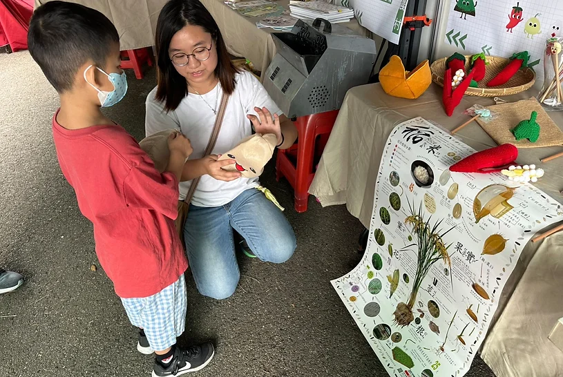黑皮泥思土地學院的小昀老師也透過教具與小農夫分享稻米脫穀的流程,