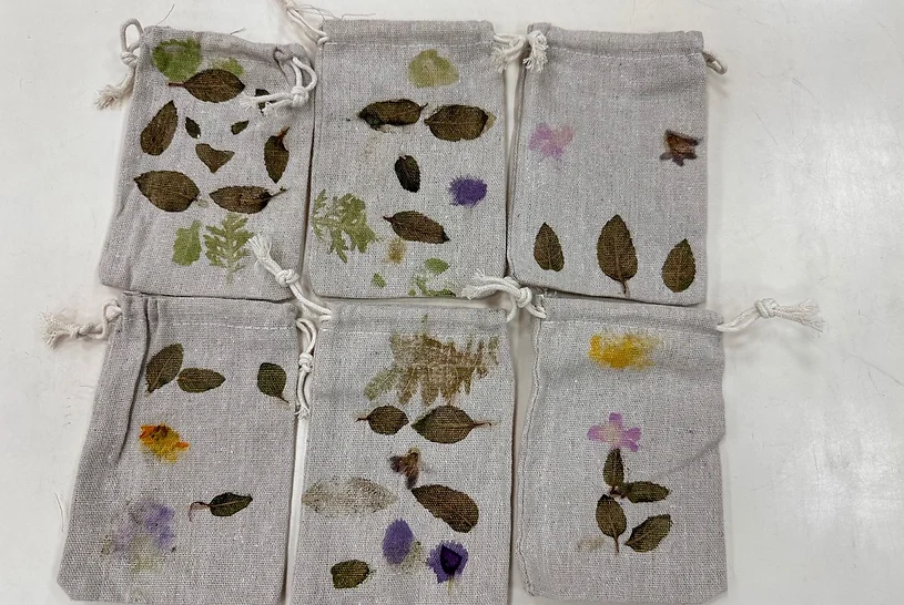 孩子說可以用鎚子槌葉子到紙上,還有布上,那還可以鎚在哪裡呢?老師拿出製作好的棉麻束口袋,讓孩子們看看槌染的成果,孩子們發出哇!好漂亮。接著就是鎚子的安全使用方法及槌染的技巧說明。